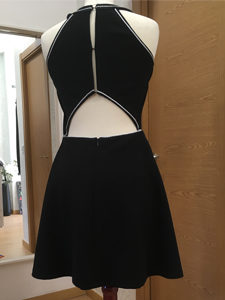 Mono de terciopelo adornado con bies blanco y negro y polipiel, con cremallera en la parte delantera.