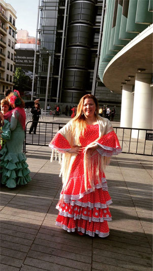 Vestido de flamenca con volantes elaborados con bies de raso blanco.
