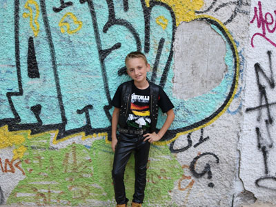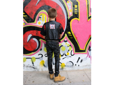 Traje de rockero : chaleco y pantalon.El chaleco esta elaborado con cordones a los laterales y cremalleras en la parte delantera, complementado con adornos de piramides metalicas.